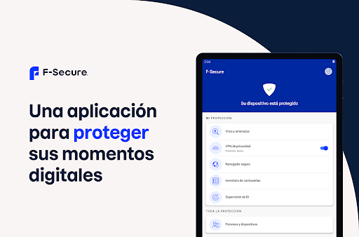 La seguridad integral de F-Secure facilita la protección de todos sus momentos digitales. Obtenga antivirus, VPN, gestión de contraseñas y protección de la identidad en una misma aplicación. Elija la suscripción que satisfaga sus necesidades, o bien consiga todo en una sola aplicación.