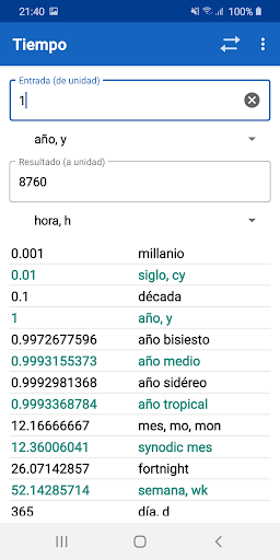 Dispone de los factores de conversión más importantes para unidades de longitud, área, volumen, masa, fuerza, energía, temperatura y tiempo. Y, además, proporciona muchas unidades y categorías altamente especializadas.