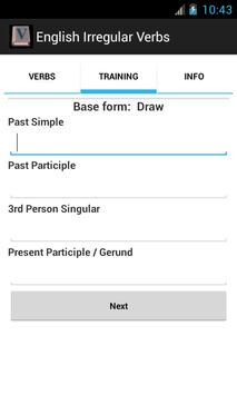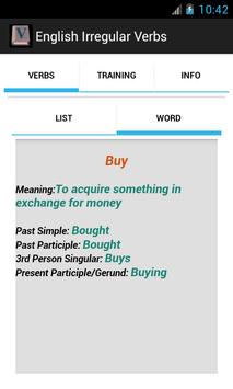 This application contains a list of 620 English irregular verbs, including their base form, past simple, past participle, 3rd person singular, and the present participle / gerund.
