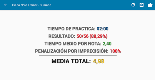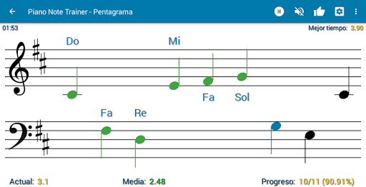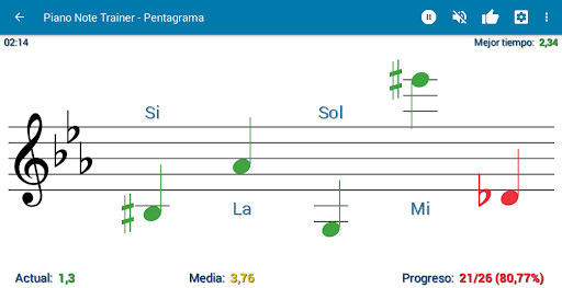 ✔ Modos de practica o temporizado. Cada parámetro (rango de notas, accidentales, armaduras, duración) tiene asignado su "mejor tiempo". Si tienes asignado tu mejor tiempo en una configuracion, al cambiarla (ej.: añadiendo sostenidos), siempre verás tu mejor tiempo según la configuración actual.