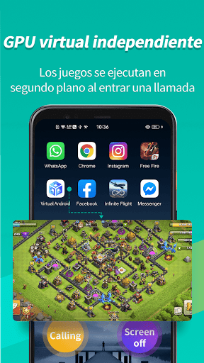 Virtual Android permite que juegos/aplicaciones se ejecuten en segundo plano mientras los usuarios utilizan otras aplicaciones. Por ejemplo, al jugar Free Fire se puede jugar con dos personajes al mismo tiempo y los juegos no dejarán de ejecutarse al entrar una llamada telefónica, por lo tanto, no es necesario comprar otro dispositivo o una telefonía Cloud para usos específicos.