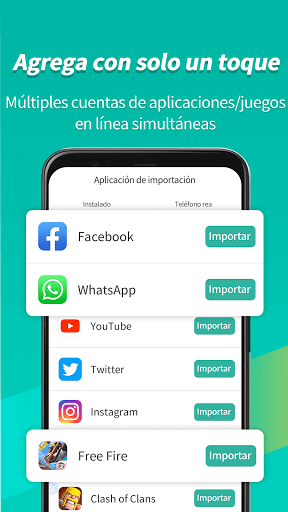 Los juegos/aplicaciones se clonan al importarlos a Virtual Android, por lo que puedes ejecutar varias cuentas simultáneamente en un mismo dispositivo. Además, este espacio paralelo ejecutará tu cuenta dual a través de un sistema virtual de alta velocidad. Inicia y cierra sesión en dos cuentas de aplicaciones de mensajería instantánea y recibe mensajes en ambas cuentas. Usa dos cuentas de juegos en línea simultáneamente para obtener el doble funcionalidad y experiencia; y separa el trabajo de la vida personal al ejecutar dos cuentas en redes sociales.