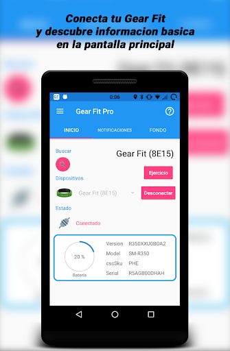 Primero realiza una búsqueda para encontrar tu Gear Fit y una vez que lo hayas encontrado pulsa el botón para conectar. Tanto en tu teléfono móvil como en tu Gear Fit te aparecerá un mensaje para que confirmes la conexión, pulsa en los dos sitios aceptar y en unos segundo tu Gear Fit ya estará funcionando con Gear Fit Pro.