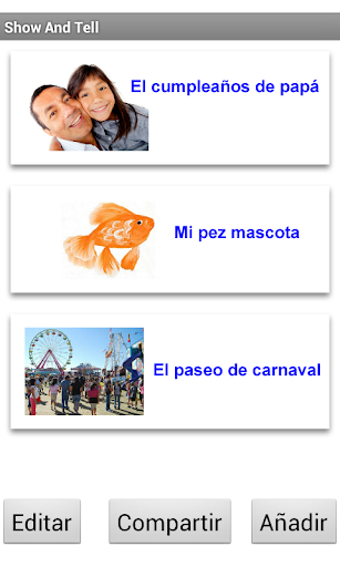 Mostrar y contar es una nueva, simple y divertida forma de compartir historias y eventos utilizando su tableta o teléfono. Niños, padres y profesores pueden usarlo para mejorar la comunicación con imágenes, vídeos, sonidos y texto a voz. De jardín de infantes a la educación especial, cualquier persona puede beneficiarse de esta nueva forma de expresar los recuerdos y las ideas. Versão em espanhol.