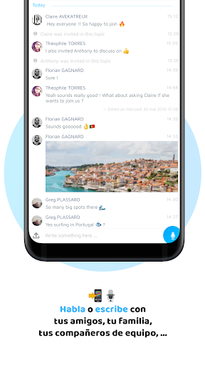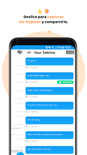 Una vez que se enciende el micrófono, todo lo que le dices a los demás es escrito en tiempo real en tu línea de conversación personal. Desliza un simple gesto para guardar y compartir tu mensaje. Usted puede incluso seguir en cualquier momento los otros mensajes capturados por otros miembros sobre los temas que le apasionan!