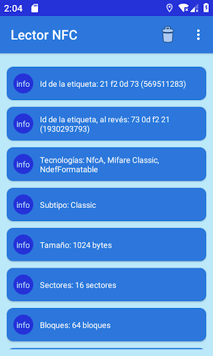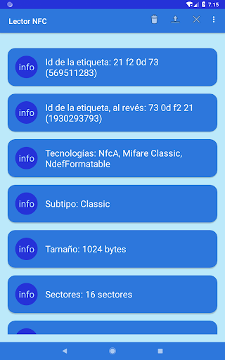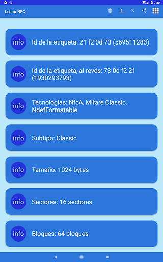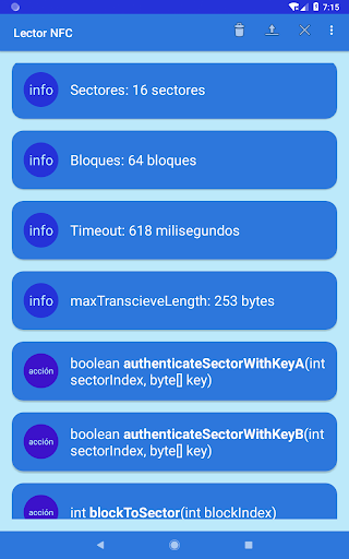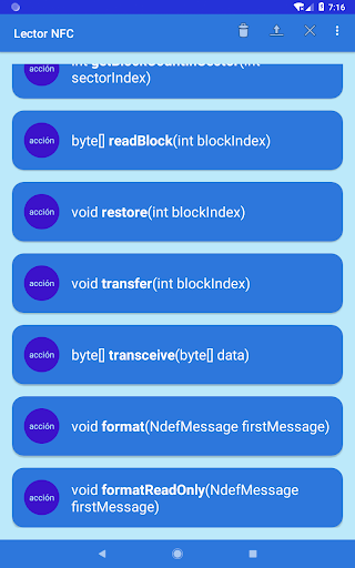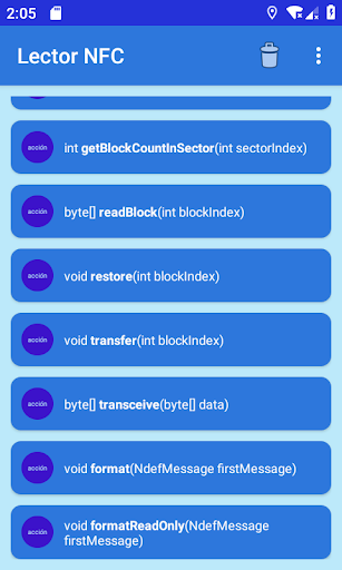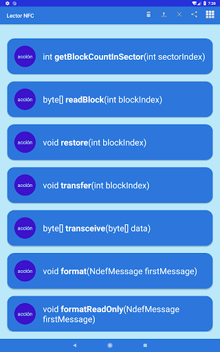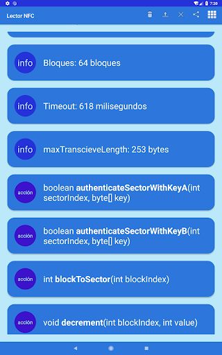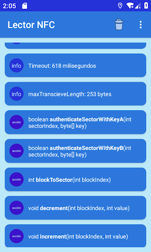 - Interfaz visual realmente sencilla. Te mostrará un único listado con toda la información recivida de la etiqueta NFC. También te mostrará todos los métodos disponibles.
