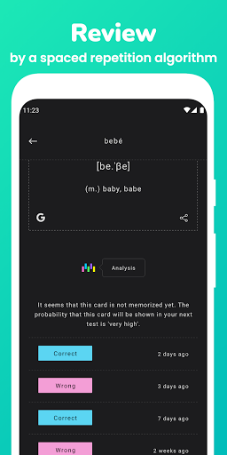 -Por la comparación de su hábito para otros usuarios, AI personaliza continuamente el nivel de dificultad y la cantidad de la prueba para la memorización del vocabulario eficaz.