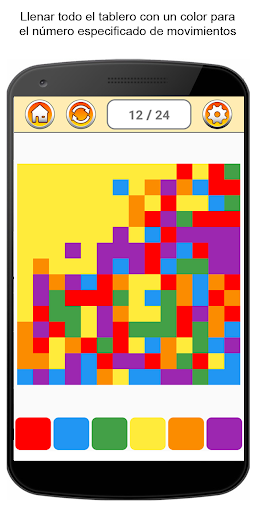 Color de Inundación - el campo de juego se representa como cuadrados multicolores. El juego comienza desde la esquina superior izquierda. Seleccione un color en la parte inferior del campo y cambie el color del cuadrado al color del vecino. El objetivo del juego es llenar el campo de juego con un color para un cierto número de movimientos. En la configuración, puede cambiar el número de colores y el tamaño del campo.