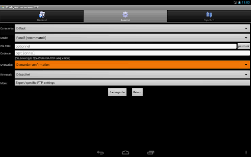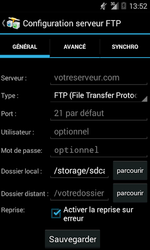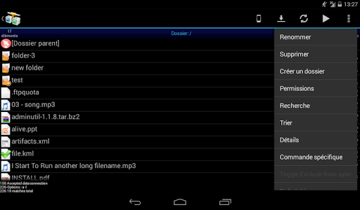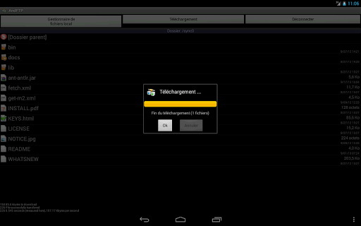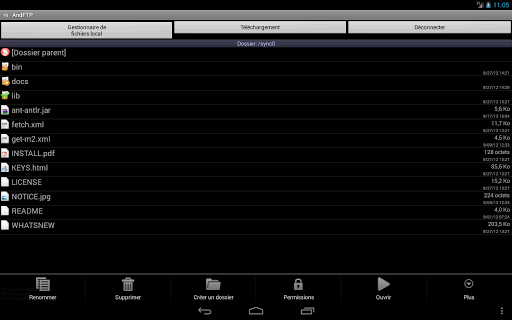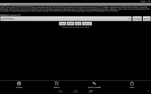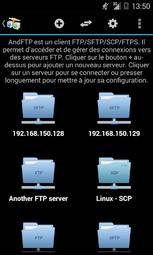 AndFTP est un client FTP/SFTP/SCP/FTPS pour les appareils Android. Il permet d'accéder et de gérer des connexions vers des serveurs FTP. Il intègre un gestionnaire de fichiers local et distant. Il permet de télécharger, depuis et vers un serveur FTP, des fichiers et/ou des dossiers. Il supporte la reprise sur erreur. Il propose un menu permettant de renommer, supprimer, copier, mettre à jour des permissions et créer des dossiers. Il supporte les protocoles FTP (File Transfer Protocol), SFTP (SSH Secure FTP), SCP (SSH Secure Copy Protocol) et FTPS (Explicite FTP sur TLS/SSL). La synchronisation de répertoires est disponible avec la version Pro seulement.