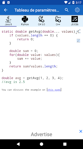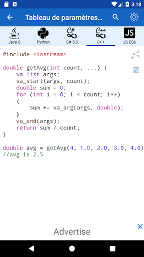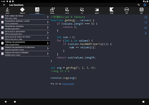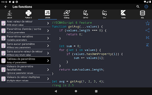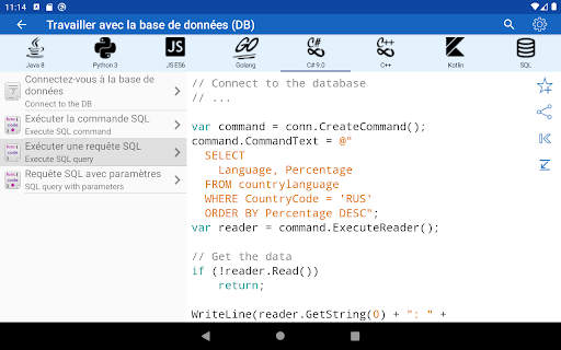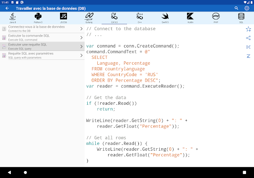 ✓ Vous ne savez pas quel langage de programmation choisir? L'application peut comparer la syntaxe de chaque exemple dans différents langages de programmation et prendre une décision équilibrée lors du choix d'un langage de programmation.
