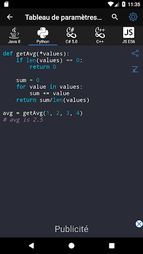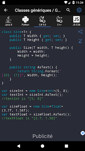 ✓ C'est une excellente aide pour ceux qui utilisent souvent plusieurs langages de programmation. L'application réduit le temps requis pour passer à une syntaxe différente.