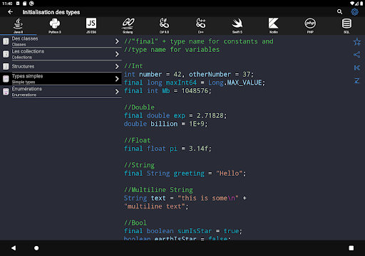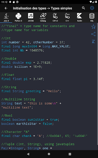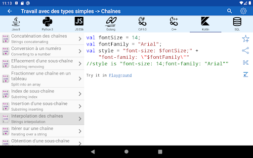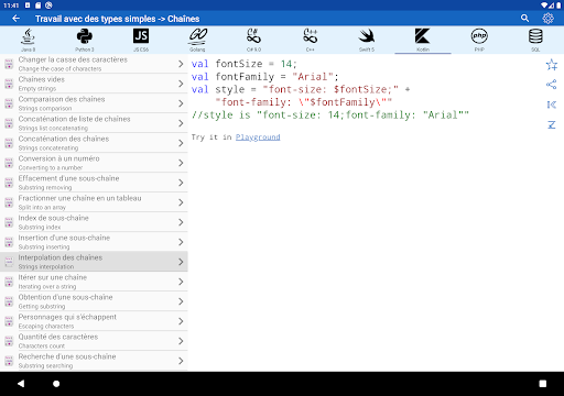 ✓ Apprendre la syntaxe du langage sur des exemples de code spécifiques. Comment obtenir une sous-chaîne ? Comment déclarer une méthode généralisée? Ceux-ci et plus de 250 d'autres exemples de code pour chaque langue sont disponibles dans l'application.