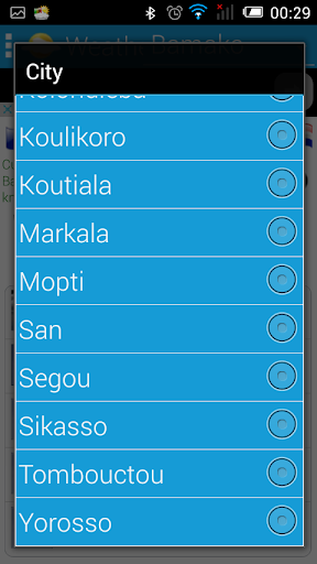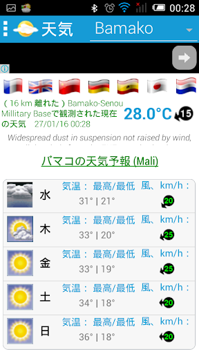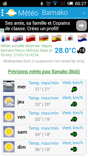 Prévisions Météo sur Cinq(5) jours pour toutes les villes du Mali. Les perspectives, les températures Min et Max, les vitesses et directions du vent, les couvertures nuageuses etc.
