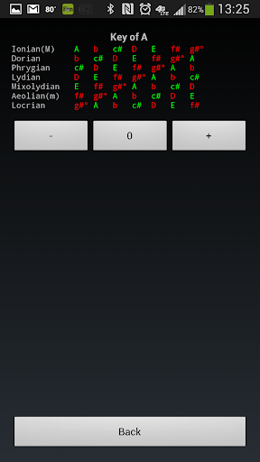 Affichages Keyfurles échelles ioniennes (majeures), doriennes, phrygiennes, lydiennes, mixolydies, éoliennes (mineures) et locaques.