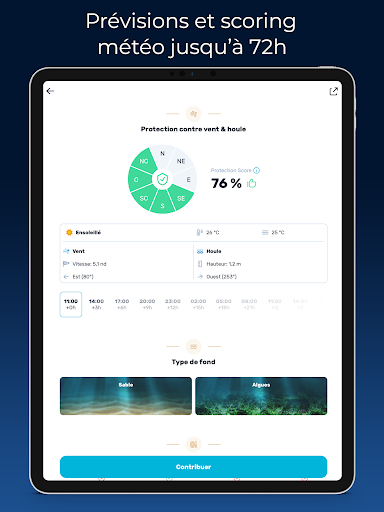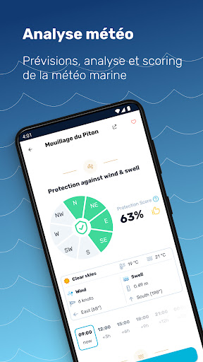 Prédictions Météo et scoring à 72hr, Calcul de distances et itinéraires automatiques, Mode hors-ligne, Filtres avancés sur la carte & pas de Publicité