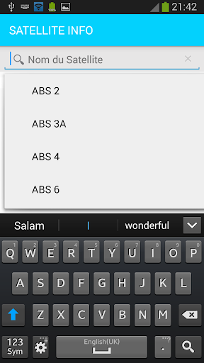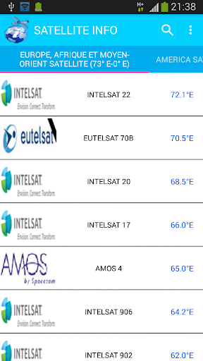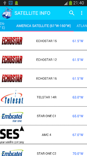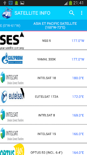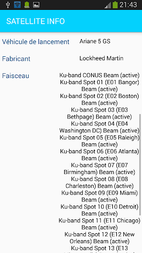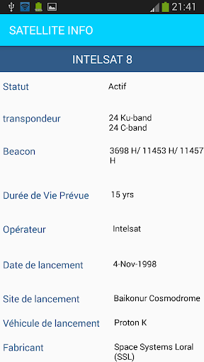 SATELLITE INFO est une application d'information complète, qui vous donne des informations détaillées sur plus de 260 satellites y compris le statut, la position, des transpondeurs, des balises, des poutres, l'opérateur, la date de lancement, le site de lancement, véhicule de lancement, le fabricant, durée de vie prévue et plus.