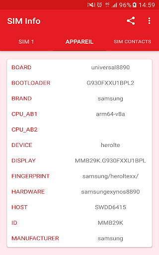 Un onglet Appareil est proposé affichant un certain nombre d'informations statiques propres à votre smartphone ou à votre tablette comme : le Board, le Constructeur, la Marque, le code d'Affichage, le Hardware de l'appareil ou le Bootloader utilisé. Enfin, l'onglet SIM Contacts vous permet de découvrir tous les Contacts sauvegardés dans votre Carte SIM. Un appui long sur un Contact vous permettant de copier le numéro associé dans votre presse-papiers.