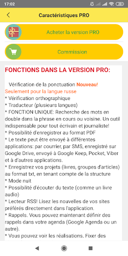 Nous développons constamment et améliorerons l'application. De nouvelles fonctionnalités apparaîtront. Après la mise à jour, les nouvelles fonctionnalités seront automatiquement disponibles pour ceux qui ont acheté la version PRO. En outre, une fonctionnalité gratuite apparaîtra.