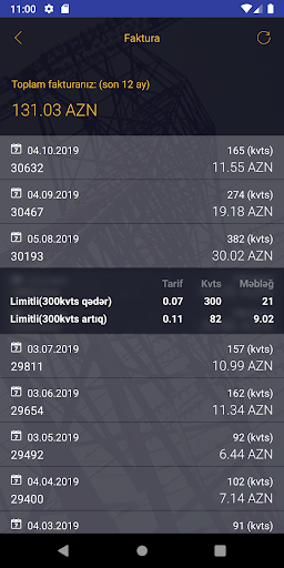 B) Vous pouvez voir la consommation d'énergie mensuelle en appuyant sur le menu de la facture en tant que KW et Manat. C'est la consommation d'électricité que vous utilisez dans un mois.