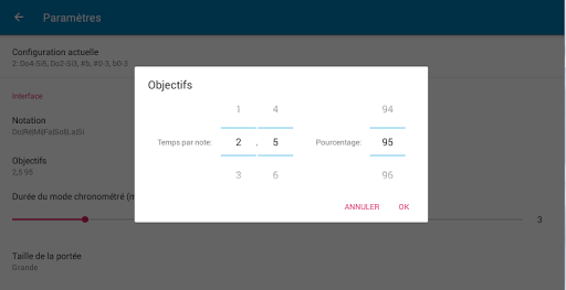 ✔ Choix des armatures: jusqu'à 7 dièses ou 7 bémols sur l'armure (ou armature). A noter que vous pouvez régler le minimum et le maximum sur la même valeur pour pratiquer une tonalité bien spécifique (par exemple, pour La majeur, dièses: 3-3).