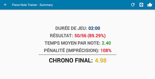 ✔ Barre d'état avec diverses indications: chrono en cours, temps moyen pour chaque note, nombre de bonnes notes / nombre total de notes jouées ( pourcentage de bonne réponses). Les objectifs, à savoir le temps moyen pour chaque note et le pourcentage de bonnes réponses, peuvent être personnalisés dans les paramètres du logiciel.