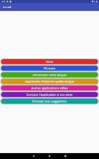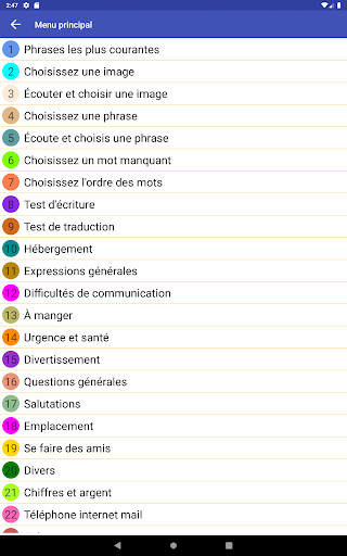 Cette application gratuite vous aidera à apprendre à lire, écrire et prononcer des mots et des phrases. Vous pouvez apprendre une ou plusieurs des 100 langues, telles que l'anglais et le français. C'est un jeu éducatif amusant et facile à utiliser qui comprend des milliers de mots et de phrases qui vous fournissent des connaissances dans des situations du monde réel. L'application est classée en 100 sujets couvrant la vie quotidienne ou les situations de voyage.