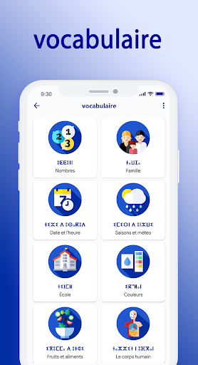 nombres, école, Lire et écrire, Couleurs, Sport, Famille, Date et l'heure ,Saisons et météo ,Fruits et aliments ,Le corps humain.