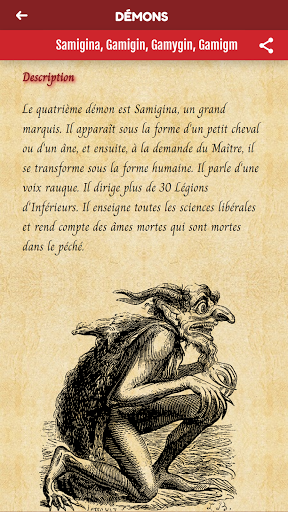 L'application contient tous les noms, ordres, descriptions et fonctions de tous les Esprits que Salomon aurait évoqués et confinés dans un vase de bronze scellé, ainsi que les symboles et personnages appartenant à chaque démon.