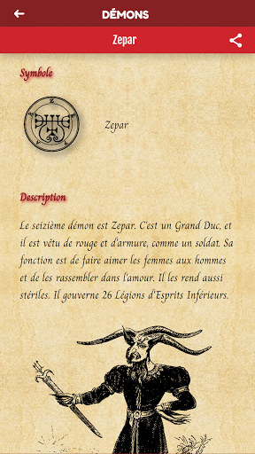 Cette application attribue un rang et un titre de noblesse à chaque membre de la hiérarchie infernale, et donne aux démons des "signes auxquels ils doivent prêter allégeance", ou symboles.