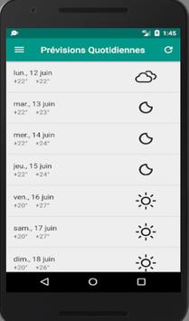 - Plus d'informations: heure du lever du soleil, heure du coucher du soleil, humidité, probabilité de précipitation, visibilité, vitesse du vent, température sensible, etc.