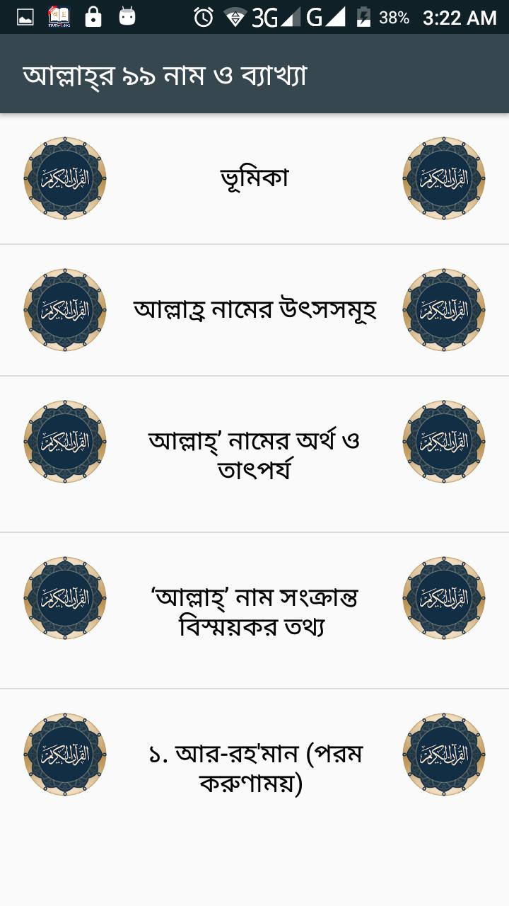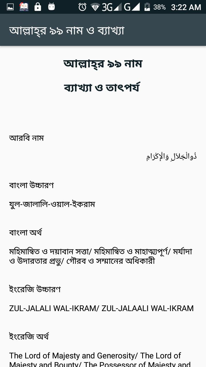 This app is a collection of 99 names of Allah in Bangla. It covers: