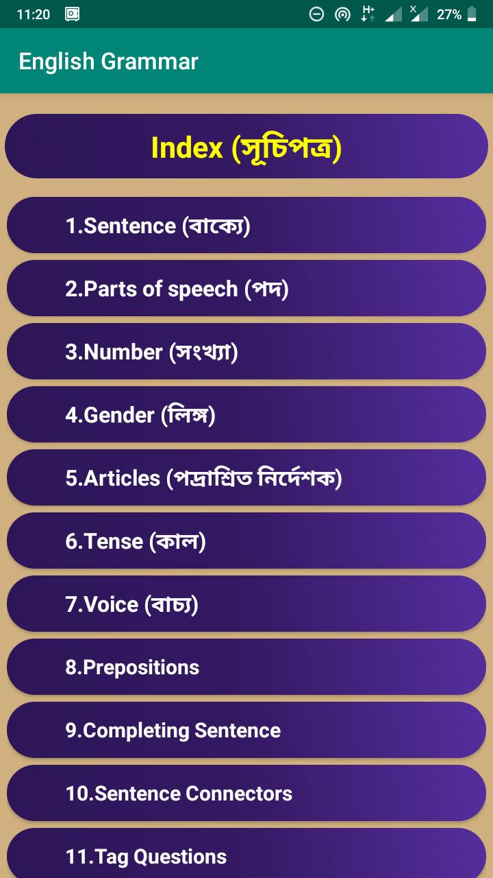 This app will help you to learn English Grammar, eg. Alphabet, Sentence, Articles এবং Articles এর ব্যবহার, Tense, Preposition, Appropriate Preposition, Completing Sentence-এর নিয়মাবলী, Right form of verbs, Transformation of Sentence, Voice Change, Narration, Degree and Change of Degrees-এর নিয়মাবলী, Pronoun Reference, Punctuation, Sentence Connectors, Uses of Some Special Words or Phrases, English Language Lesson- Modifiers, Synonyms-Antonyms and Tag Questions, How to Question (কিভাবে প্রশ্ন করতে হয়), Proverb, Idioms ও Phrases, ইংরেজিতে কথা বলার ফর্মুলা, স্পোকেন ইংলিশ, English Vocabulary Word Lists, Conversation also.