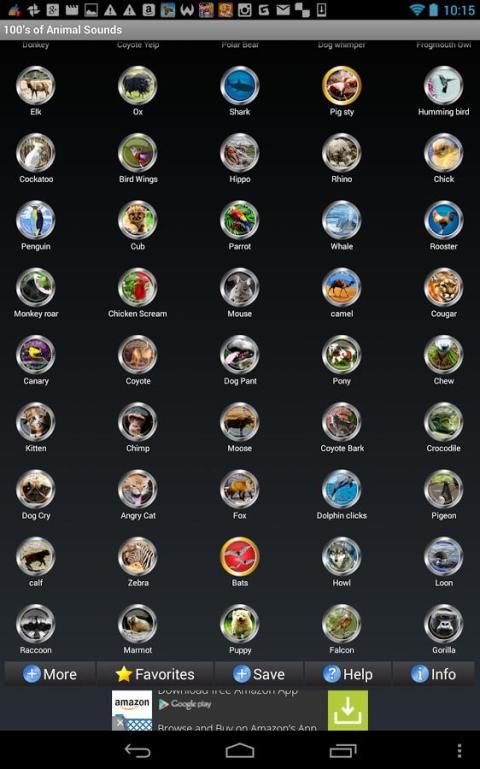 ईगल, चिम्प, कूकाबुरा, बिल्ली, मेंढक, डॉल्फिन, हाथी, चिकन, शेर, बाघ, भालू, क्रिकेट, गाय, सुअर, भेड़, हॉक, पिल्ला, कौवा, तोता, शावक, कैनरी, हिप्पो, टट्टू, मूस, फॉक्स, मगरमच्छ, एक प्रकार की पक्षी, Marmot, ज़ेबरा, और भी बहुत कुछ !!!