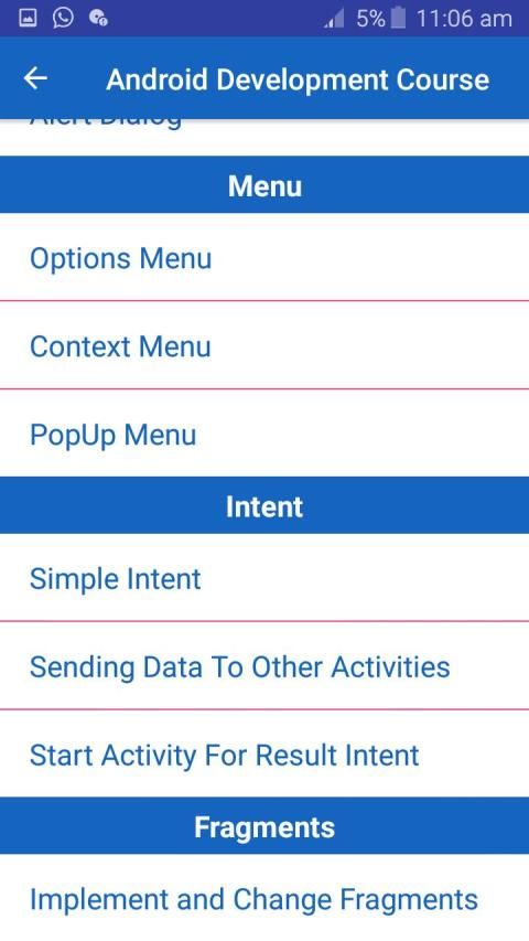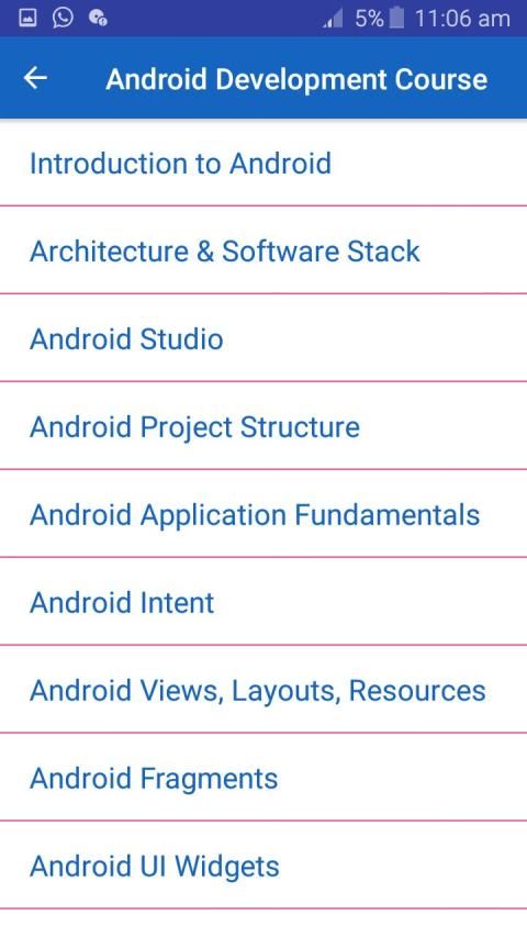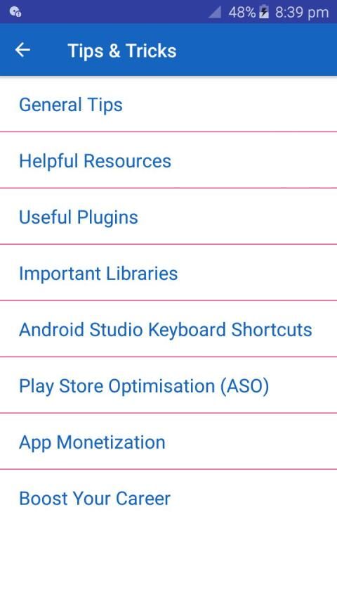 एप्लिकेशन बहुत उपयोगकर्ता के अनुकूल है उपयोगकर्ताओं के लिए Android सीखने के लिए बहुत कुछ करना। एप्लिकेशन को विभिन्न वर्गों में विभाजित किया गया है: