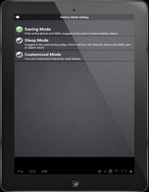 ► अपनी स्थिति के सूट करने के लिए तीन बैटरी सेवर मोड से चुनें। अपनी बैटरी जीवन को अधिकतम करने के लिए, या 'अध्ययन' मोड 'संदेश भेजने', 'नींद' या तो चयन करें