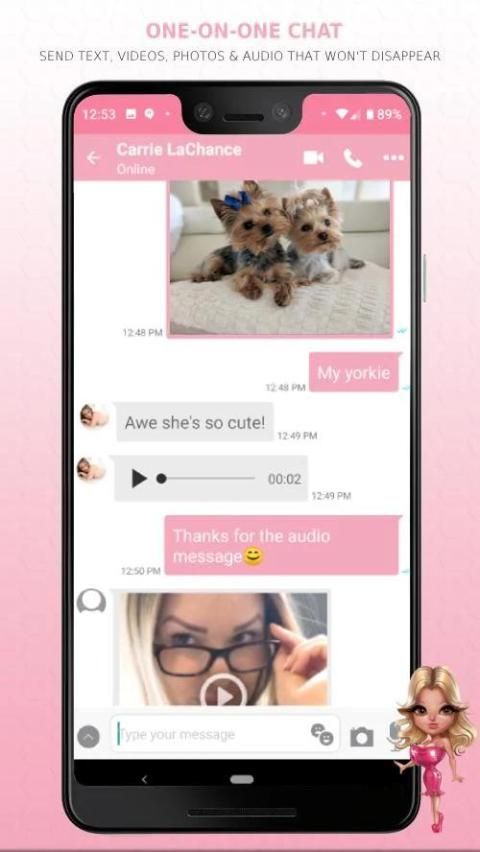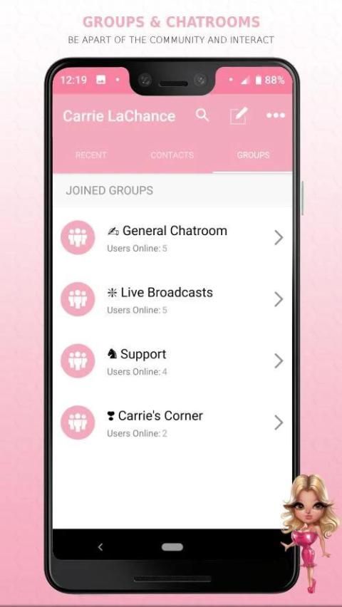 कैरी LaChance चैट ऐप के उपयोगकर्ताओं को एक-एक ऑडियो, वीडियो और टेक्स्ट चैट करते हैं, जबकि आप चलते हैं। अद्यतन और सामग्री की दैनिक खुराक के लिए समूह चैटरूम में भाग लें, चाहे आप कहीं भी हों।
