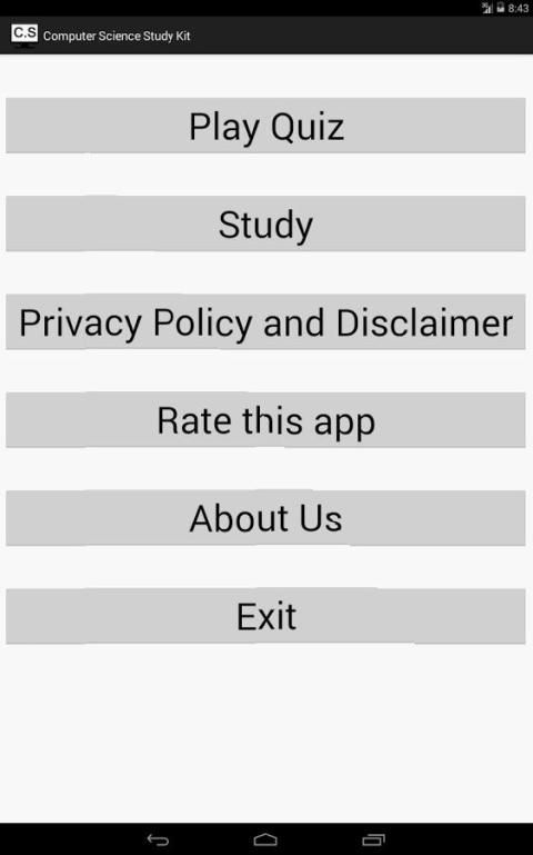 कंप्यूटर विज्ञान का अध्ययन किट जल्दी से कंप्यूटर विज्ञान विषयों में अपने ज्ञान को ताज़ा करना चाहते हैं जो छात्रों और पेशेवरों के लिए एक कंप्यूटर विज्ञान का अध्ययन आवेदन है. यह आवेदन अपने कंप्यूटर विज्ञान के ज्ञान का परीक्षण करने के लिए या कुछ अवधारणाओं के बारे में कुछ अंक या स्पष्ट संदेह का उल्लेख करने और एक परीक्षा या एक तकनीकी साक्षात्कार से पहले अंतिम समय में उनकी पाठ्य पुस्तकों का उल्लेख करने के लिए कोई समय नहीं है जो चाहते हैं उन लोगों के लिए आदर्श है.