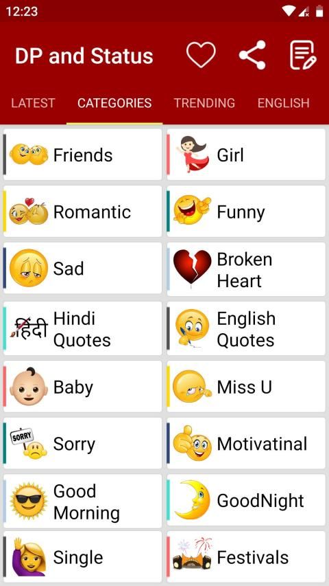 डीपी और स्टेटस में नवीनतम, ट्रेंडिंग, श्रेणीटैब के साथ सरल यूजर इंटरफेस है।