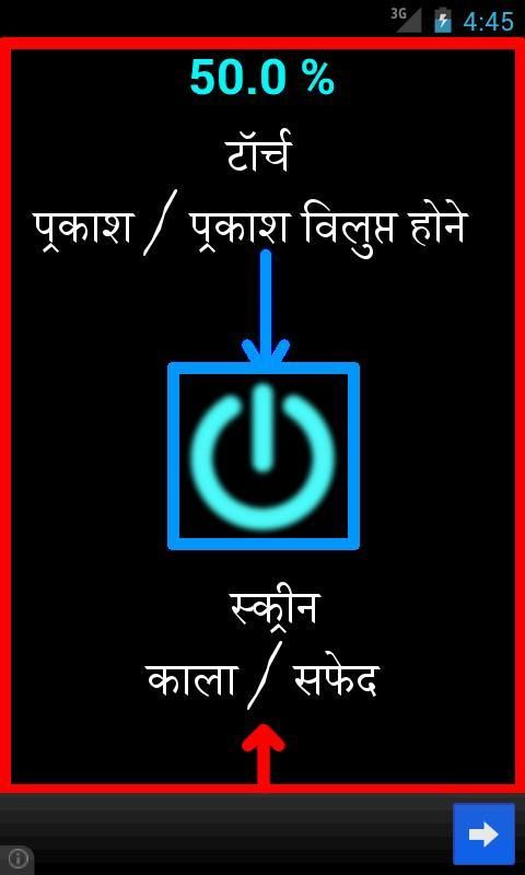 * पृष्ठभूमि स्क्रीन के रंग स्क्रीन पर बिजली बटन के अलावा किसी अन्य स्थान छूकर काले और सफेद में बदल जाएगा.