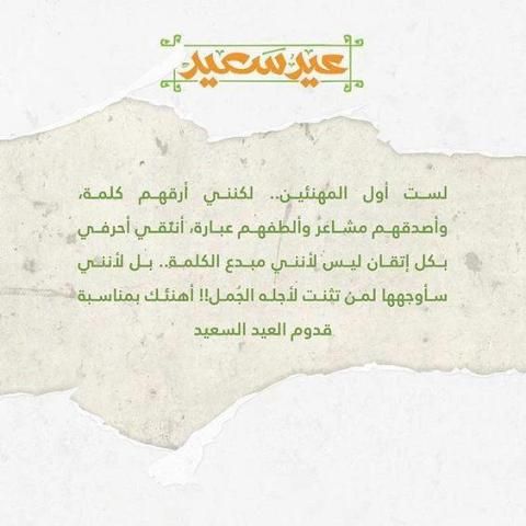 حقاً هو العيد وافى ينشر العبقا أم أنه طيفكم قد لاح في الأفقا كلاهما فرحة رقت بها لغتي فجاد حرفي والإحساس مندفقا تقبل الله منكم حقبة سلفت وزادكم طاعة في إثرها وتقى عيدكم مبارك."