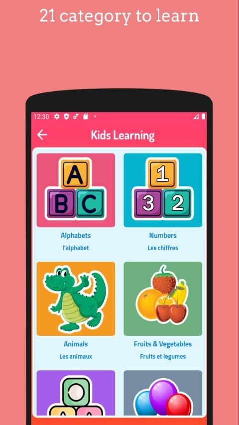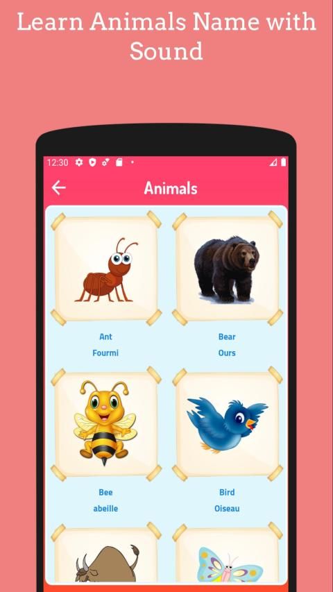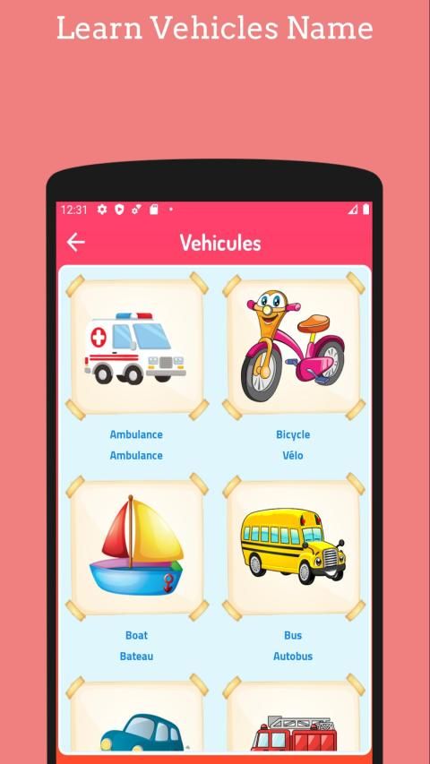 इसके अलावा, बच्चों को अंग्रेजी भाषा को ध्वनि और छवि के साथ पढ़ाने के आवेदन में अंग्रेजी भाषा को कई भाषाओं में पढ़ाने की सुविधा शामिल है: