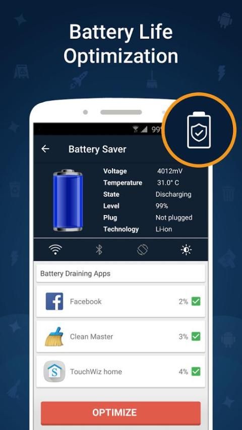 आप इस तरह के वोल्टेज और तापमान के रूप में बैटरी की स्थिति देखने के लिए अनुमति देकर अपने स्मार्टफोन की बैटरी जीवन का अनुकूलन। बैटरी बिजली की अत्यधिक मात्रा लेने वाली क्षुधा की एक सूची प्रदान करता है।