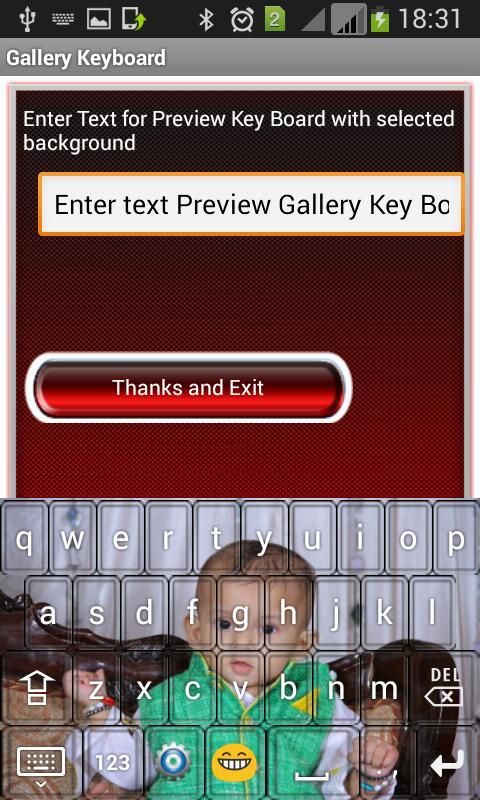 गैलरी कीबोर्ड के लिए आप device.Now आप इस आप अच्छा अपने प्यार एक तस्वीर कीबोर्ड background.Feels के रूप में के सेट कर सकते हैं, जबकि अद्भुत background.you साथ कुंजी बोर्ड टाइप का उपयोग करके पुराने कीबोर्ड के साथ गैलरी कीबोर्ड की जगह ले सकता एंड्रॉयड हैं आश्चर्यजनक और अद्भुत छवि गैलरी कुंजी बोर्ड है राजधानी के लिए> छोटे> संख्या और विशेष characters-> पूंजी पत्र और भी इमोजी कुंजी कुंजीपटल आसानी से कीबोर्ड बदल सकते हैं।