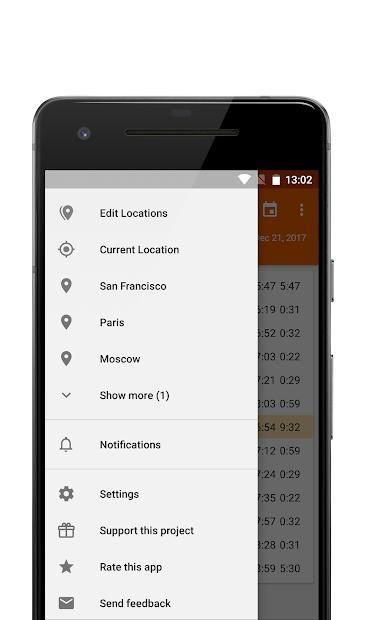 किसी भी स्थान पर समय और सूर्योदय, सूर्यास्त और अन्य सूरज की रोशनी चरणों की अवधि की गणना के लिए आसान और सुविधाजनक उपकरण।