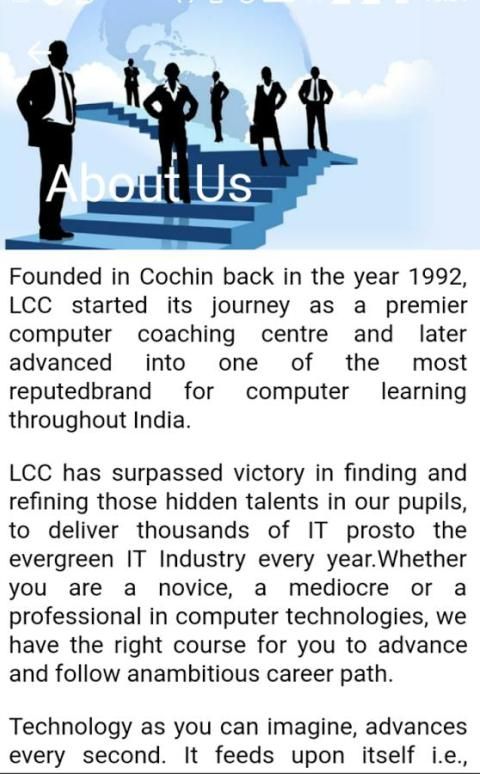 कोचीन वर्ष 1992 में वापस आ गया में स्थापित, एल सी सी एक प्रमुख कंप्यूटर कोचिंग केंद्र के रूप में अपनी यात्रा शुरू की और बाद में भारत भर में कंप्यूटर सीखने के लिए सबसे reputedbrand में से एक में उन्नत। एल सी सी खोजने और हमारे विद्यार्थियों में उन छुपा प्रतिभा को परिष्कृत करने, आईटी के हजारों देने के लिए जीत पार कर चुकी है सदाबहार आईटी उद्योग हर year.Whether आप एक नौसिखिया, एक औसत दर्जे का या कंप्यूटर प्रौद्योगिकी में एक पेशेवर हैं prosto, हम आप के लिए सही पाठ्यक्रम है अग्रिम और anambitious कैरियर मार्ग का अनुसरण करने के लिए।
