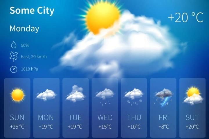 Various weather widgets with current temperature, real-time weather, weather forecast, city, clock & calendar of current location.