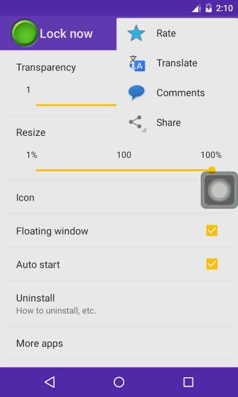 केवल एक नल किसी भी समय स्क्रीन लॉक करने के लिए। यह आवेदन अपने फोन को लॉक करने के लिए डिवाइस व्यवस्थापक अनुमति की जरूरत है। अन्यथा, यह काम नहीं करेगा।