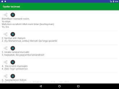 Dasturda Fotha, Yasin, Kavsar, Ixlos, Falaq, Nos suralari tarjimasi va qiroati o'zbek tilida, arab tilida va lotin yozuvuda keltirilgan.