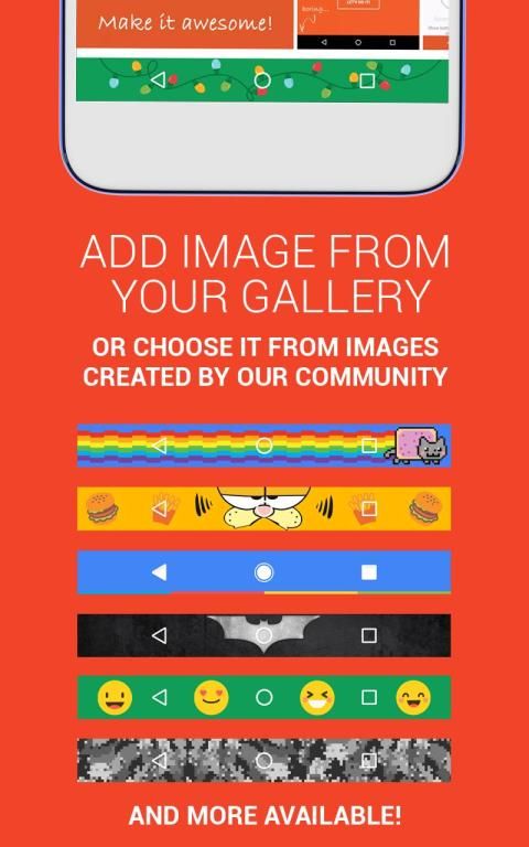 Turn it blue, make it red - anything you want. Select cool image as background or match color automatically to fit it to running app. Whatever you choose, it will be awesome! And then you can add some data, like battery level.