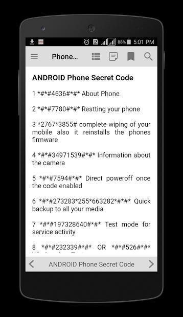 Are you looking for mobile phones secret codes, hidden menus, tricks and advanced functionalities? Did you know that smartphones are equipped with secret codes that can unlock (or lock) a number of different functions? The USSD protocol allows you to access hidden features you didn't know about right from your smartphone's dialer. But there is some trickiness you will need to know about. This app lists common mobile phones tricks, and secret codes for simple and cool advanced functionalities. Download this app today to Unlock the Hidden Features on Your Phone!